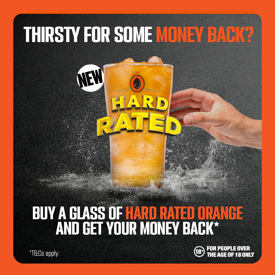 Grab a glass of Hard Rated Orange and get your money back — a cheeky little win just for treating yourself.